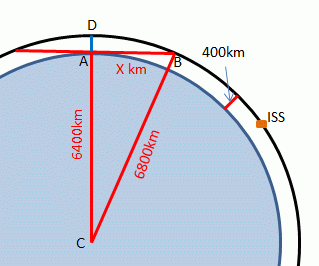 it was obvious that Pythogoras and his hypotenuse would do the trick. AB^2 = BC^2 – AC^2 = 2300km. So the distance from horizon to horizon is 4600km which is probably accurate enough. But you can do another Pythogorean calc to make it a better approximation: BD^2 = AD^2 + AB^2 = 2334km and the arc = 4668km. The ISS travels at 7.7 km/s so is visible for about 10 min. You can cross-check this with trig. Cos(AC/BC) = 0.909 and if you whip that into http://www.wolframalpha.com/input/?i=cos^%28-1%29+0.909 you find that the angle is 24.62deg. So the arc is 24.62/360th of Pi * 13600km = 2350km so the arc is 4700km but the time is still 10 minutes. It’s silly to say 10.1 minutes as the first estimate and 10.2 minutes as the second because the ISS is not going directly overhead and the chord and arc will have a different length if viewed obliquely.And the true mean radius of the Earth is not a round 6400km but slightly less - 6375km. And it's only in an ideal world that there are no trees, no clouds, no hills to obscure the horizon.